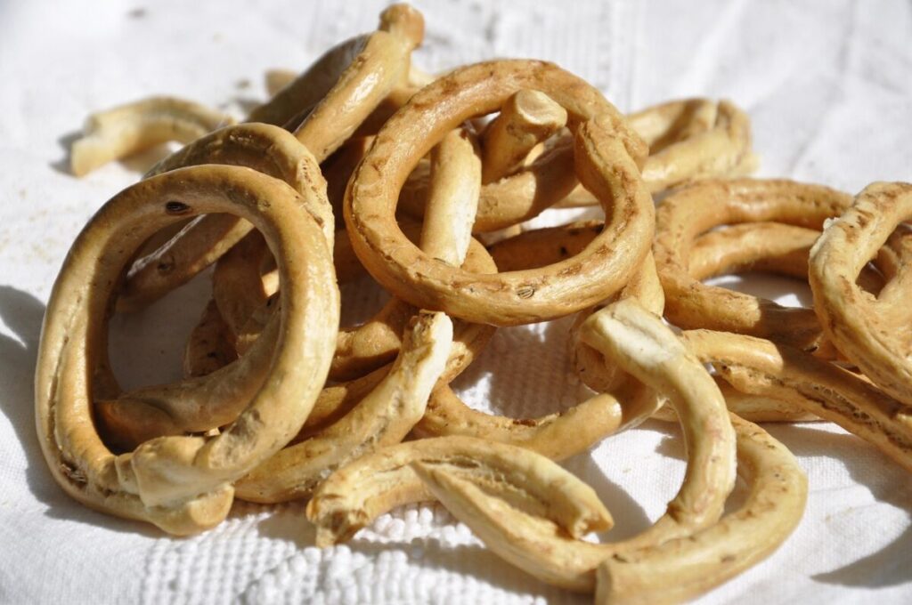 Lavora l’impasto su un piano per circa 5 minuti, forma una palla e copri con un canovaccio. Lascia riposare per 30 minuti. Forma dei “serpentelli”, taglia a misura e chiudi a cerchio premendo bene le estremità. Tuffa i taralli in acqua bollente: appena vengono a galla, scolali e adagiali su una teglia con carta da forno oliata.