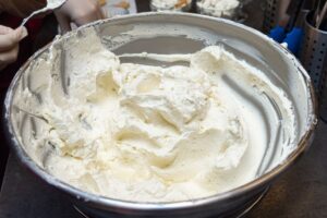 Scalda la panna con lo zucchero, poi aggiungi la gelatina strizzata e mescola finché non si scioglie. In una ciotola lavora robiola e formaggio spalmabile fino a ottenere una crema liscia, poi unisci la panna con la gelatina e amalgama tutto.
